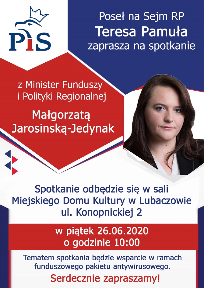 W najbliższy piątek (26.06) w Miejskim Domu Kultury w Lubaczowie odbędzie się spotkanie z Minister Funduszy i Polityki Regionalnej Małgorzatą Jarosińską-Jedynak. Tematem spotkania będzie wsparcie w ramach funduszowego pakietu antywirusowego.