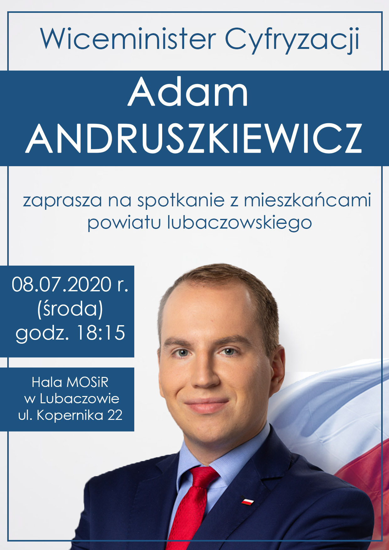 W najbliższą środę (08.07) o godz. 18:15 w hali MOSiR w Lubaczowie odbędzie się spotkanie z wiceministrem cyfryzacji Adamem Andruszkiewiczem.