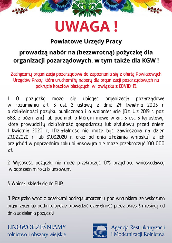 Wniosek o pożyczkę należy złożyć do Powiatowego Urzędu Pracy, właściwego ze względu na miejsce prowadzenia działalności. Wysokość pożyczki nie może przekraczać 10% przychodów w poprzednim roku bilansowym, skorzystać z niej mogą organizacje pozarządowe (w tym KGW), które prowadziły działalność przed dniem 1 kwietnia 2020 r. Wszelkie informacje i formularze można znaleźć na stronie PUP w Lubaczowie pod linkiem: