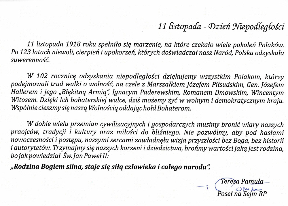W 102 rocznicę odzyskania niepodległości dziękujemy wszystkim Polakom,
