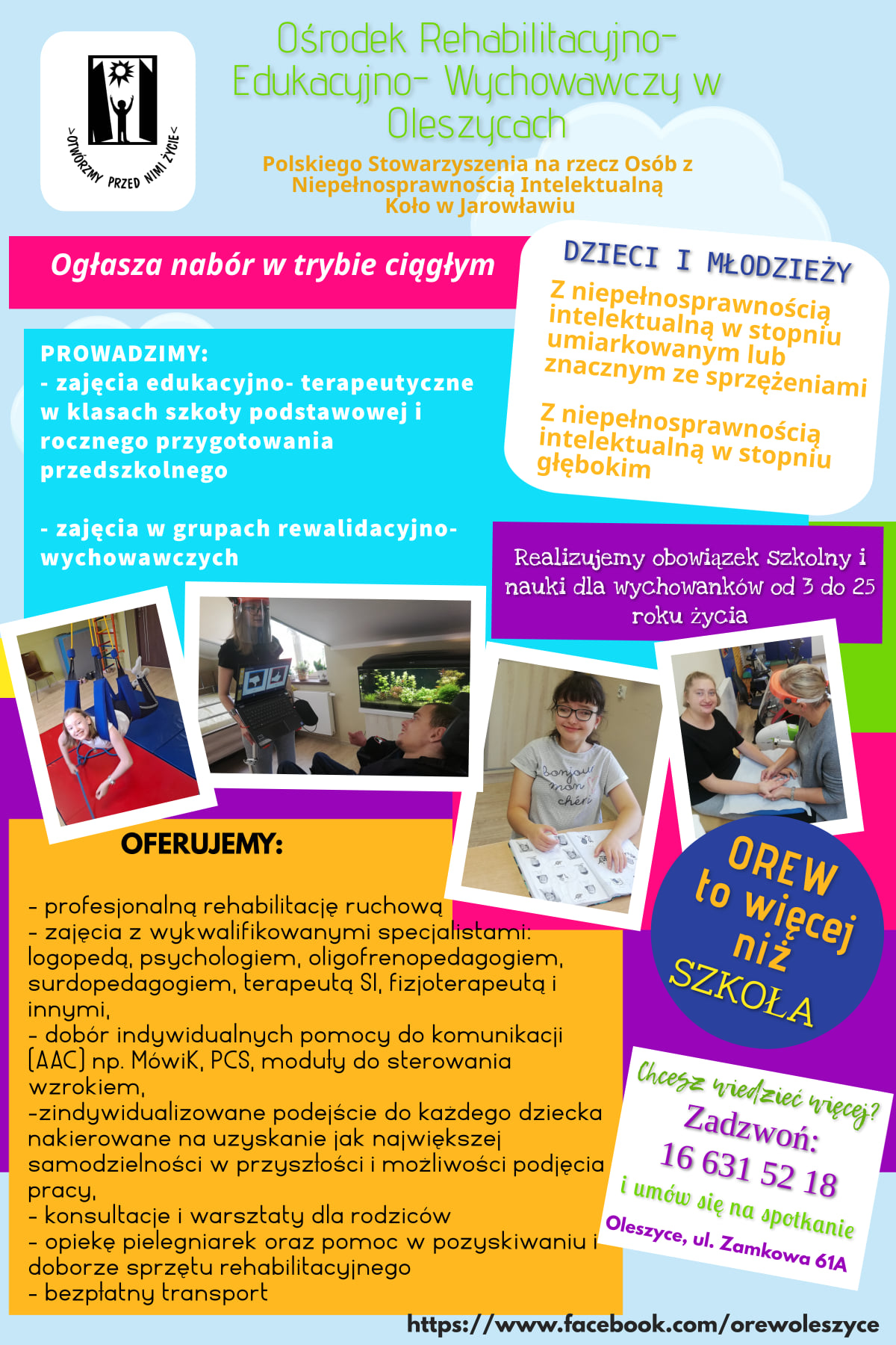 OREW jest niepubliczną, wielospecjalistyczną placówką oświatową prowadzoną przez Polskie Stowarzyszenie na rzecz Osób z Niepełnosprawnością Intelektualną Koło w Jarosławiu. Oferuje wielospecjalistyczne, kompleksowe wsparcie oparte na indywidualnym podejściu do każdego dziecka oraz opiekę specjalistów, takich jak: fizjoterapeuta, logopeda, psycholog, oligofrenopedagog, terapeuta Integracji Sensorycznej i innych.