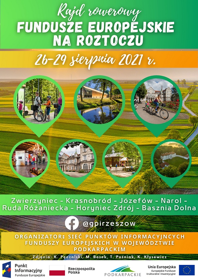 Sieć Punktów Informacyjnych Funduszy Europejskich w województwie podkarpackim przy współpracy z Siecią Punktów Informacyjnych Funduszy Europejskich w województwie lubelskim organizuje w dniach 26-29.08.2021 r. rajd rowerowy „Fundusze Europejskie na Roztoczu” na trasie Zwierzyniec – Basznia Dolna.