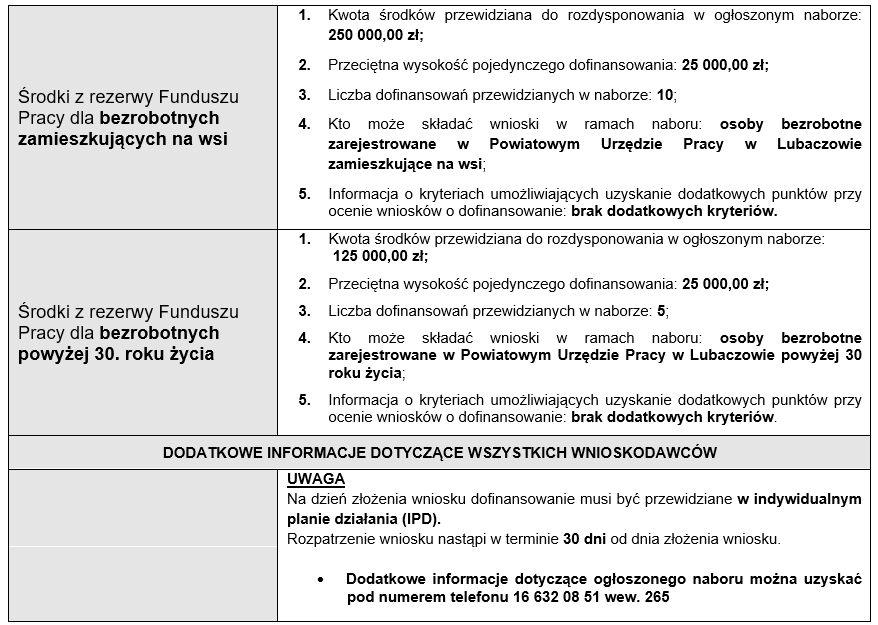 Szczegółowe informacje dotyczące kwalifikowania wniosków o dofinansowanie do konkursu zawarte są w siedzibie Powiatowego Urzędu Pracy w Lubaczowie lub na stronie internetowej urzędu: http://lubaczow.praca.gov.pl