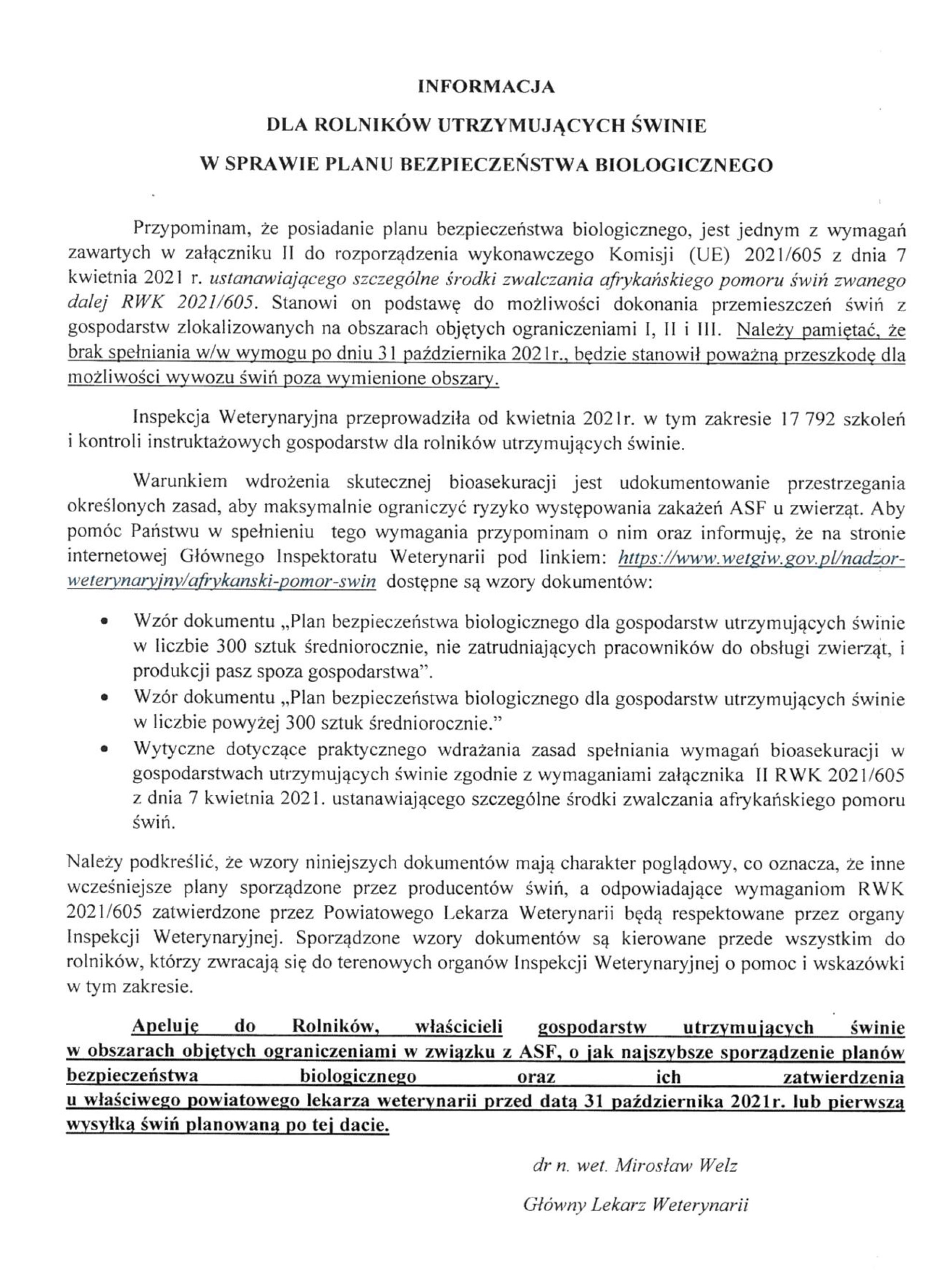 Lubaczowskie biuro Agencji Restrukturyzacji i Modernizacji Rolnictwa w odniesieniu do zaleceń Głównego Lekarza Weterynarii przypomina o konieczności sporządzenia planów bezpieczeństwa biologicznego oraz ich zatwierdzenia u właściwego powiatowego lekarza weterynarii do końca października. Dotyczy to rolników, którzy utrzymują świnie na obszarach objętych ograniczeniami w związku z ASF.