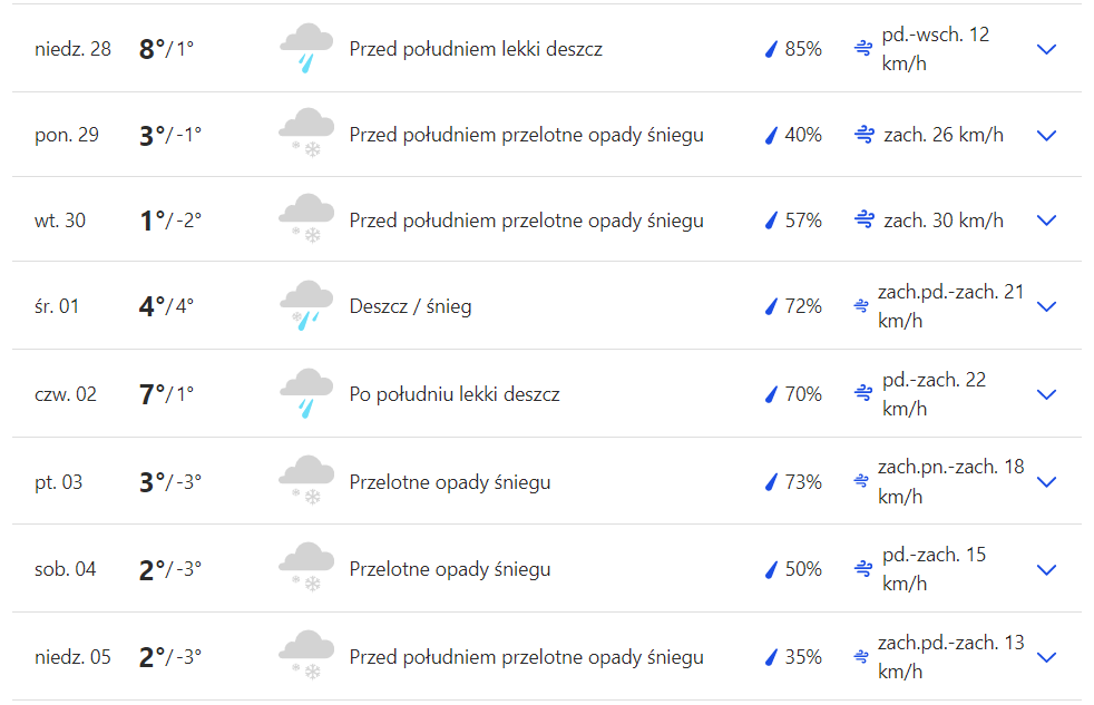Pierwsze opady śniegu mogą się pojawić już w przed południem poniedziałek. Temperatura w dzień 3 stopnie, a w nocy będzie delikatny mróz. Także we wtorek istnieje możliwość opadów śniegu. W środę znacznie większa szansa opadów deszczu i śniegu. Czwartek przyniesie delikatne ocieplenie, bo na termometrach może pojawić się nawet 7 stopni. Weekend podobnie jak na początku tygodnia z przelotnymi opadami śniegu i temperaturą oscylująca w granicach 0 stopni.