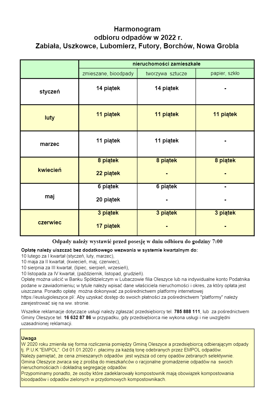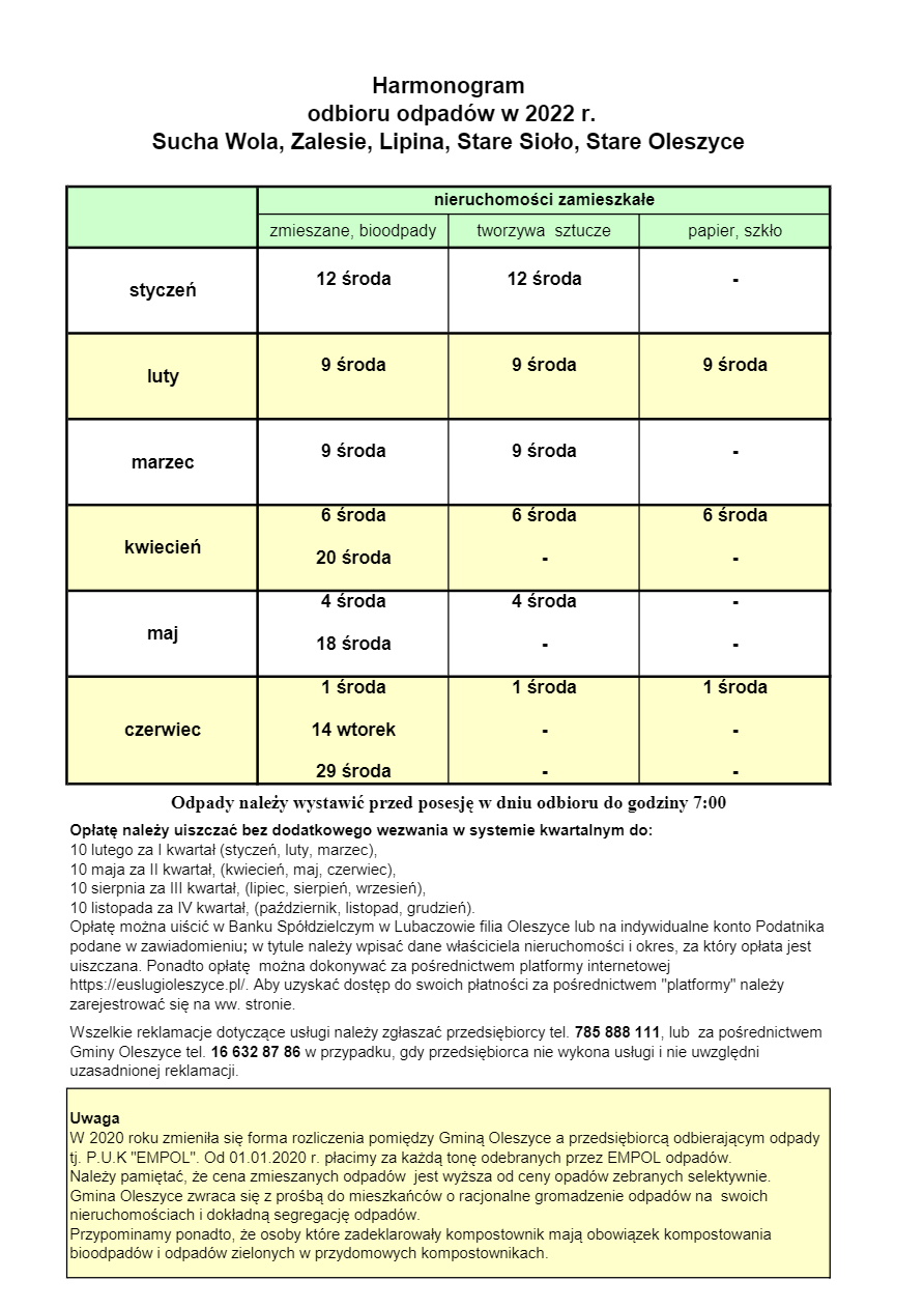 Publikujemy ceny oraz harmonogram odbioru odpadów komunalnych w pierwszym półroczu 2022 roku w gminie Oleszyce.
