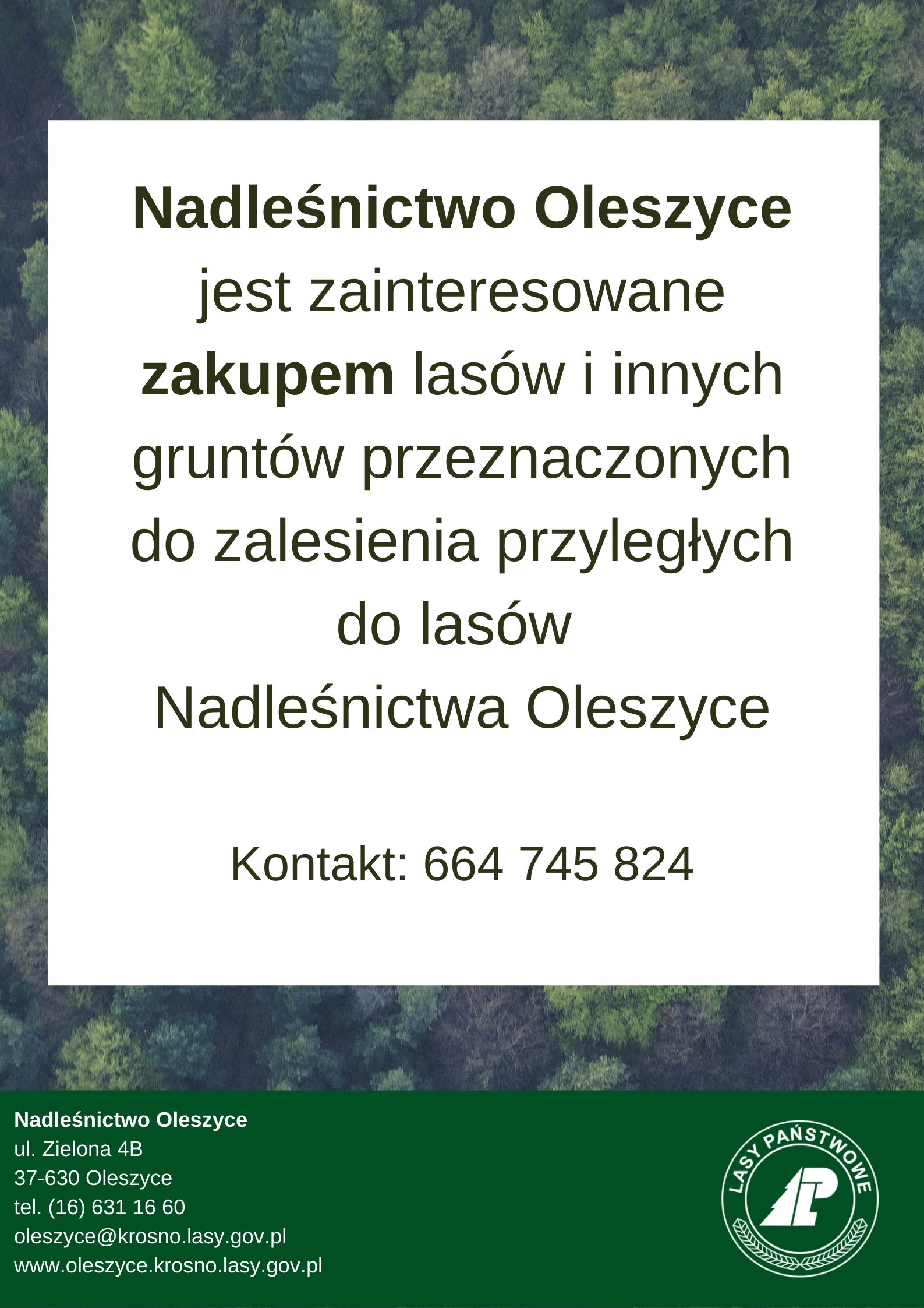 Nadleśnictwo Oleszyce działając między innymi na podstawie Ustawy o lasach, ma za cel zwiększać lesistość, sadząc las na gruntach do tego przeznaczonych. W związku z powyższym leśnicy z Oleszyc zainteresowani są zakupem lasów i innych gruntów przeznaczonych do zalesienia przyległych do lasów Nadleśnictwa Oleszyce, czyli położonych na terenie gmin Oleszyce, Stary Dzików, Cieszanów oraz Wiązownica.