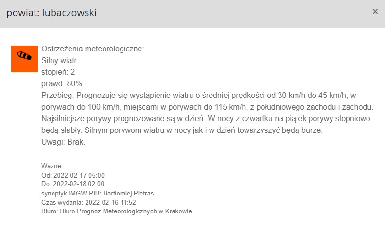- Meteorolodzy prognozują wystąpienie wiatru o średniej prędkości od 30 km/h do 45 km/h, w porywach do 100 km/h, miejscami w porywach do 115 km/h, z południowego zachodu i zachodu. Najsilniejsze porywy prognozowane są w dzień. W nocy z czwartku na piątek porywy stopniowo będą słabły. Silnym porywom wiatru w nocy jak i w dzień towarzyszyć będą burze.