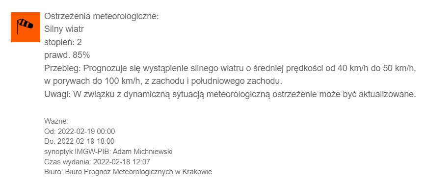 Ostrzeżenie jest ważne w sobotę (19.02) od godz. 00:00 do godz. 18:00.