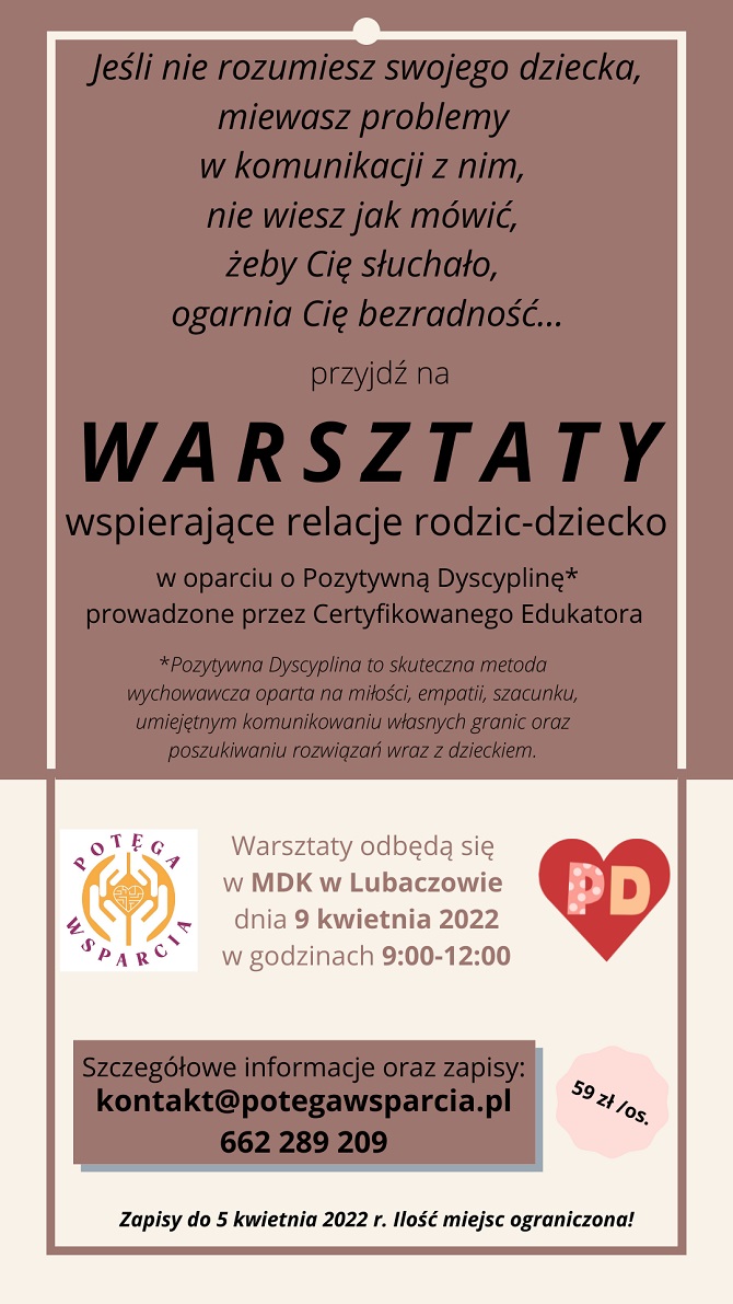Jeśli nie rozumiesz swojego dziecka, miewasz problemy w komunikacji z nim, nie wiesz jak mówić, żeby Cię słuchało i ogarnia Cię bezradność to przyjdź na warsztaty wspierające relacje rodzic-dziecko, które odbędą się 9 kwietnia w MDK w Lubaczowie. Właśnie ruszyły zapisy.