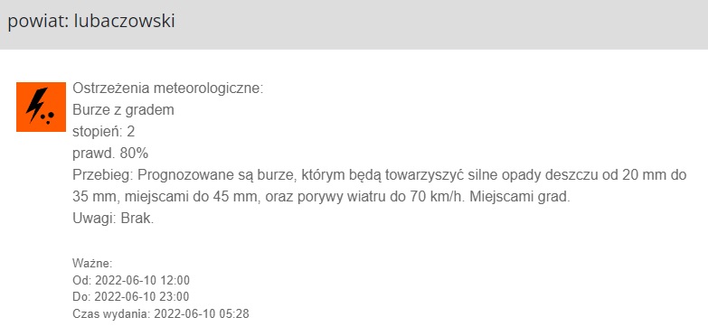 Instytut Meteorologii i Gospodarki Wodnej ostrzega, że na terenie powiatu lubaczowskiego mogą wystąpić burze z gradem.