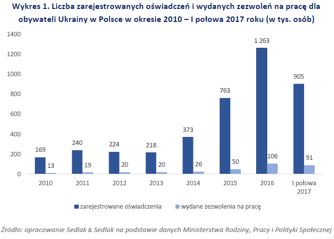 Według danych Zakładu Ubezpieczeń Społecznych, 541 tys. cudzoziemców w Polsce płaci składki na ubezpieczenia społeczne. Około 403 tys. z nich to Ukraińcy, którzy stanowią 74% wszystkich zagranicznych płatników. Zgodnie z danymi Ministerstwa Rodziny, Pracy i Polityki Społecznej, liczba oświadczeń o chęci powierzenia pracy Ukraińcom w Polsce od 2013 roku stale rośnie. W 2016 zarejestrowano 1,263 mln tego typu oświadczeń, a w I połowie 2017 już ponad 900 tys. Dodatkowo rośnie liczba wydawanych zezwoleń na pracę w naszym kraju dla obywateli zza wschodniej granicy. W 2016 roku 106 tys. Ukraińców uzyskało pozwolenie na pracę w Polsce. Było to ponad dwukrotnie więcej niż w roku poprzednim.