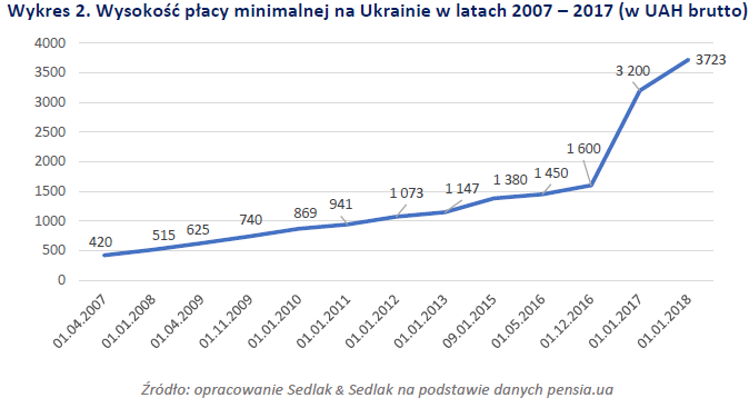 Obecnie płaca minimalna na Ukrainie wynosi 3 723 UAH, co odpowiada wartości ok. 443 PLN brutto. Aktualne wynagrodzenie minimalne obowiązujące na Ukrainie jest ponad 4 razy niższe niż w Polsce (2 100 PLN brutto). W ubiegłym roku wysokość pensji minimalnej osiągnęła wartość 3 200 UAH. Minimalne wynagrodzenie obowiązujące w 2017 roku było ponad trzy razy wyższe niż 10 lat wcześniej - w 2007 roku. Płaca minimalna na Ukrainie w ciągu ostatniej dekady rosła. Obecnie osiąga najwyższą wartość – 3 723 UAH brutto.