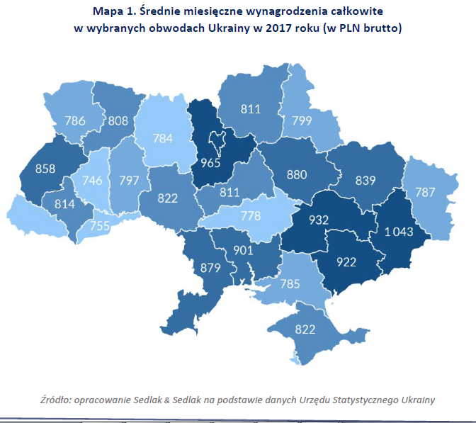 Mapa 1. przedstawia średnie miesięczne wynagrodzenie całkowite w wybranych obwodach Ukrainy w 2017 roku, przeliczone na złotówki wg średniego kursu UAH w 2017 roku. 1 UAH = 0,1343 PLN. Z danych Urzędu Statystycznego Ukrainy wynika, że najwyższe średnie miesięczne wynagrodzenie całkowite występowało w rejonie głównego ośrodka przemysłowego w Donieckim Zagłębiu Węglowym i wynosi ok. 1 043 PLN brutto (7 764 UAH). Wysokie średnie miesięczne pensje występują także w obwodach sąsiadujących z obwodem donieckim – dniepropetrowskim (ok. 932 PLN) oraz zaporoskim (ok. 922 PLN). Natomiast najniższe przeciętne zarobki osiągają mieszkańcy obwodu tarnopolskiego. Średnia pensja dla tego regionu to ok. 746 PLN brutto (5 554 UAH).