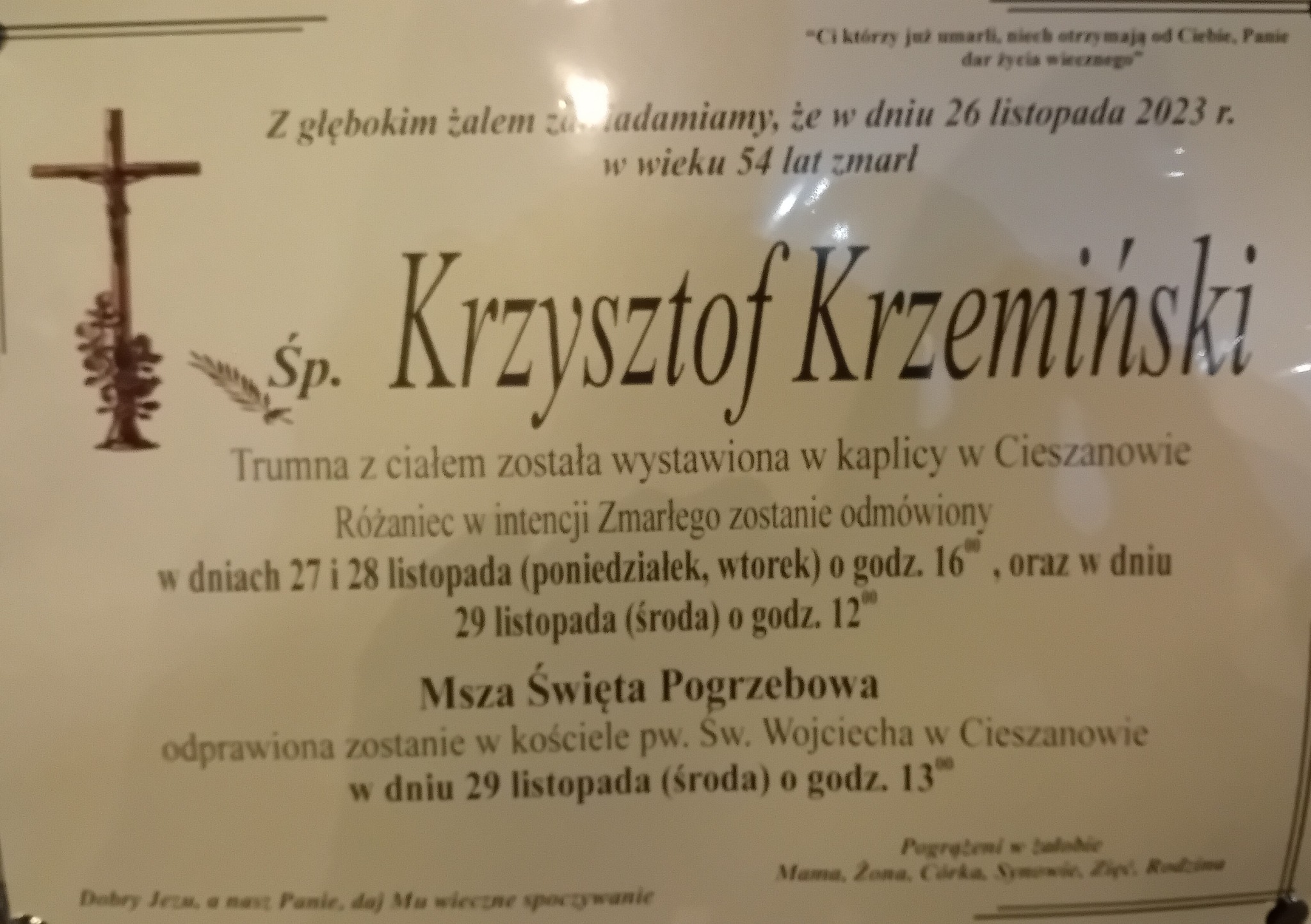 26 listopada w wieku 54 lat zmarł Krzysztof Krzemiński, długoletni działacz oraz Prezes Ochotniczej Straży Pożarnej w Cieszanowie.