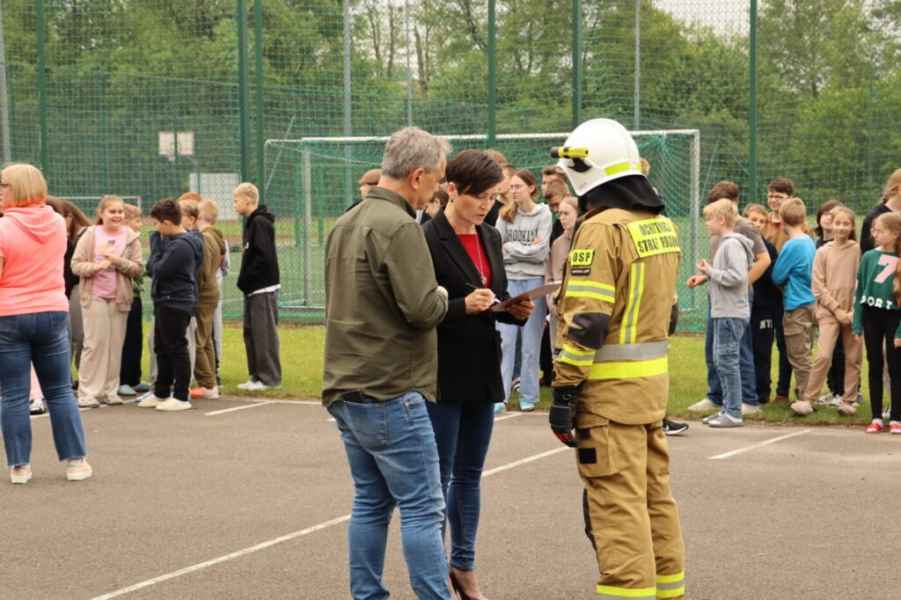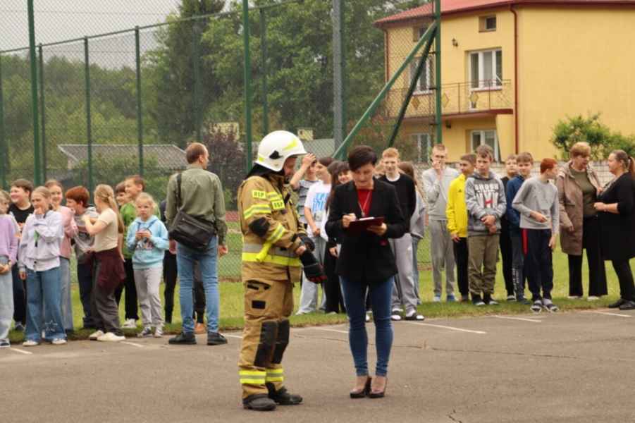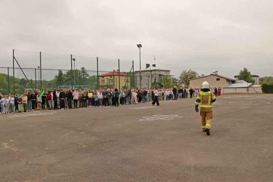 Zgodnie z przyjętym scenariuszem, w jednym z pomieszczeń szkoły doszło do symulowanego pożaru i zadymienia. Po ogłoszeniu alarmu przeciwpożarowego rozpoczęto natychmiastową ewakuację. Uczniowie i personel opuścili budynek w sposób zorganizowany i bez zakłóceń, kierując się do wyznaczonego miejsca zbiórki.