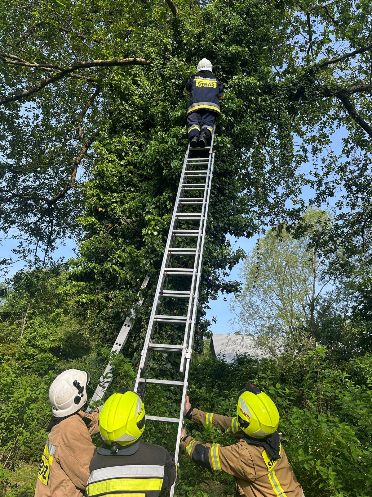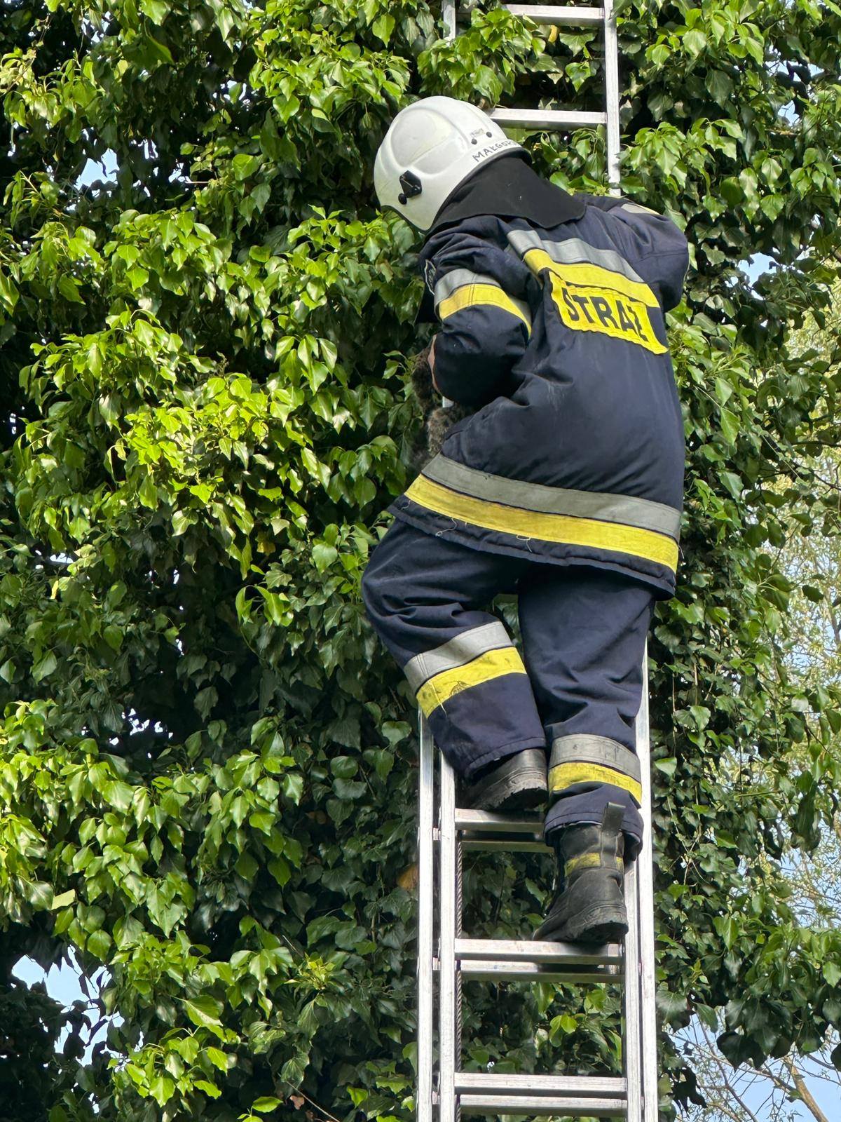 Po przybyciu na miejsce strażacy rozstawili drabinę i jeden z ratowników wspiął się na drzewo, aby bezpiecznie sprowadzić zwierzę. Cała akcja przebiegła sprawnie, a kot po chwili znalazł się z powrotem na ziemi – cały i zdrowy.