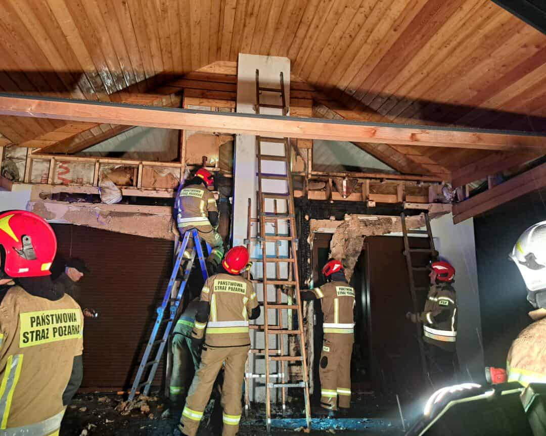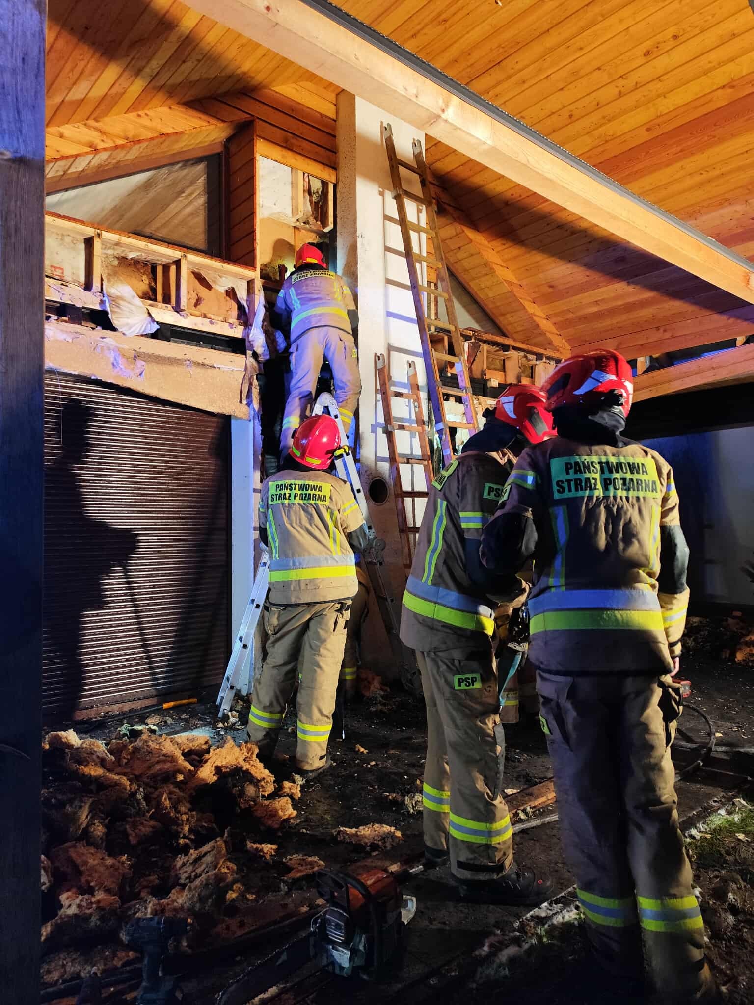 Po przybyciu na miejsce okazało się, że płonęły drewniane elementy ściany zewnętrznej. Strażacy natychmiast przystąpili do działań gaśniczych. Aby dotrzeć do zarzewia ognia, konieczny był demontaż części elewacji oraz usunięcie warstwy izolacyjnej. W trakcie akcji rozebrano fragment konstrukcji ściany, zdemontowano deski i tynk, a następnie usunięto zniszczoną wełnę drewnianą.
