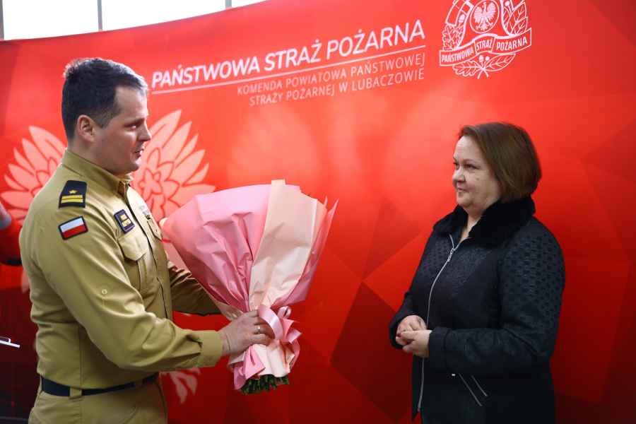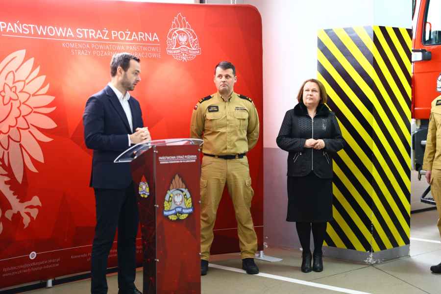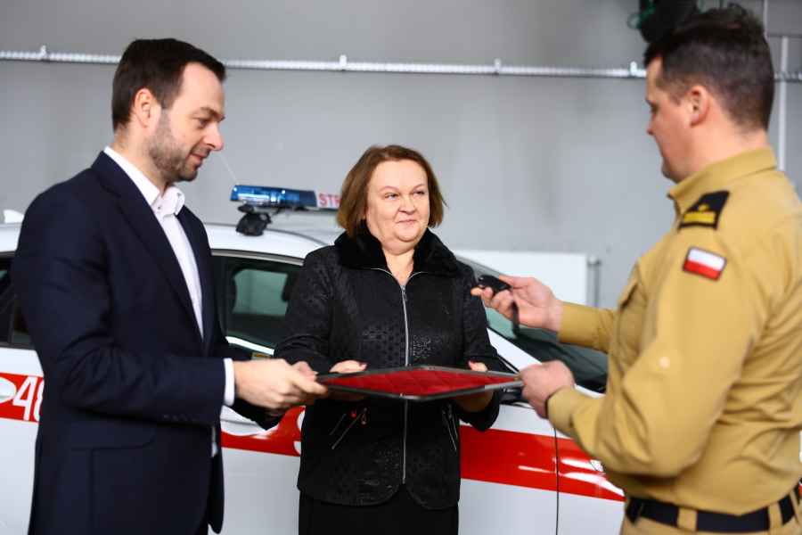 Kluczyki do nowego auta komendantowi PSP w Lubaczowie, mł bryg. Piotrowi Szpytmie, przekazali Bartosz Romowicz, poseł na Sejm RP, oraz Barbara Broź, starosta lubaczowski.