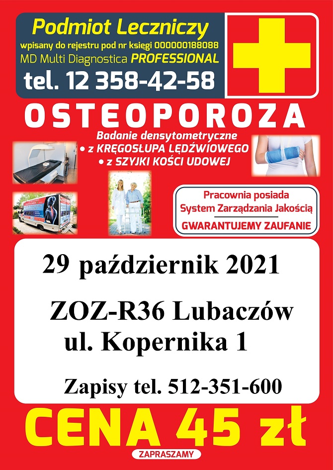 W dniu 29 października (piątek) mieszkańcy Lubaczowa i okolic będą mieli możliwość zbadania swoich kości w “osteobusie”.