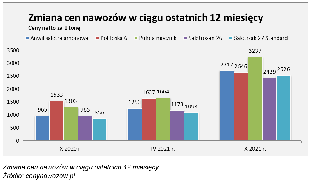 Obserwowane rekordowe podwyżki cen nawozów, które w niektórych przypadkach wzrosły aż trzykrotnie, to obecnie największa zmora rolników. Rok temu, cena mocznika wynosiła 1303 zł, po pół roku wzrosła o ponad 300 zł, obecnie za tonę mocznika trzeba zapłacić 3237 zł. Saletra w ubiegłym roku mieściła się w zakresie cenowym ok. 965 zł, obecnie jej koszt to aż 2712 zł za tonę. Podobną, aż trzykrotną podwyżkę zanotował Saletrzak, zaczynając w ubiegłym roku od ceny 856 zł, po pół roku wzrosła o 200 zł, obecnie to aż 2526 zł za tonę. Popularna Polifoska, względem ubiegłego roku, podrożała o ponad tysiąc złotych za tonę. Tak drastyczne podwyżki cen nawozów wywołały chaos w branży rolniczej, i nie ma co się dziwić, rolnicy wciąż dotkliwie odczuwają wzrost kosztów w swoich gospodarstwach.