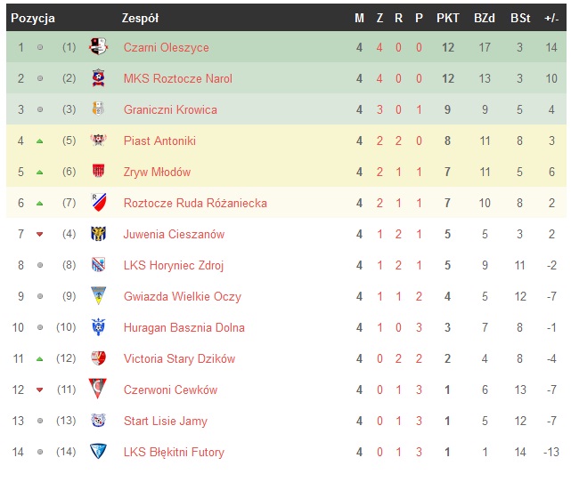 Na pierwszy miejscu pozostaje zespół z Oleszyc, który rozgromił ekipę z Futor 6:1. Tuż za nimi z taką samą ilością punktów plasuje się MKS Roztocze Narol - te drużyny w tabeli dzieli tylko bilans bramek. Spokojne trzecie miejsce zajmuje zespół Graniczni Krowica z dorobkiem 9 punktów.