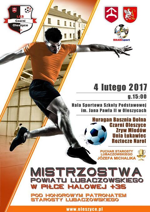 4 lutego w Hali Sportowej w Oleszycach o godzinie 15:00 rozpoczną się Mistrzostwa Powiatu Lubaczowskiego w Piłce Halowej + 35. W zawodach weźmie udział 5 drużyn. Piłkarze powalczą o puchar starosty lubaczowskiego Józefa Michalika.
