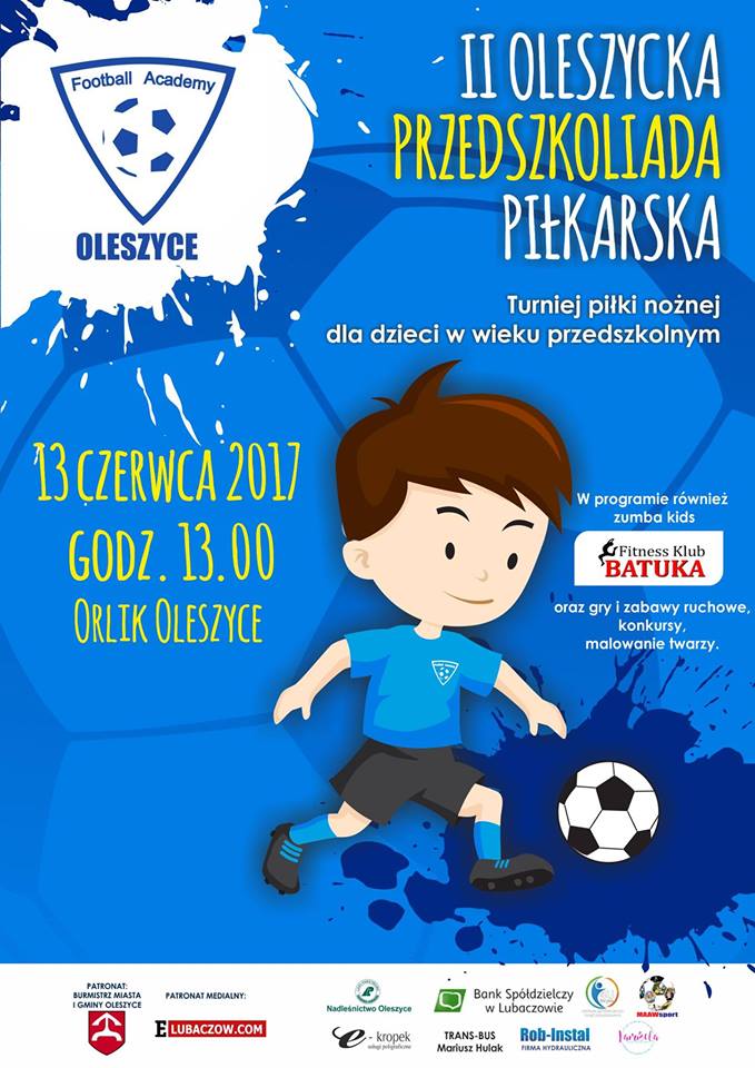 W najbliższy wtorek 13 czerwca odbędzie się II Oleszycka Przedszkoliada Piłkarska 2017 z Football Academy Oleszyce, pod Honorowym Patronatem Burmistrza Miasta i Gminy Oleszyce, w której udział wezmą wszystkie przedszkola z Oleszyc i okolic reprezentowane przez ponad 100 przedszkolaków.