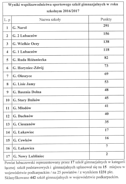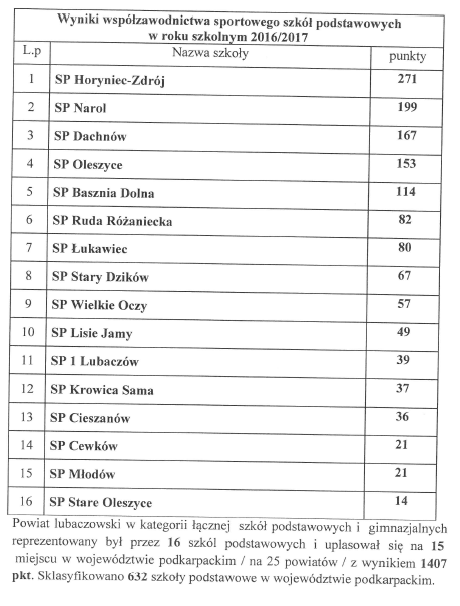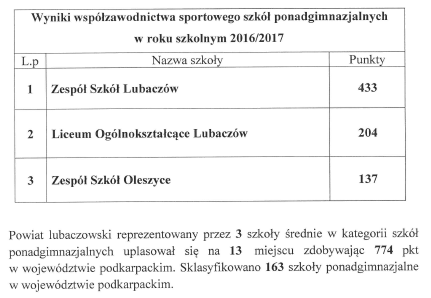 29 września w sali narad Starostwa Powiatowego w Lubaczowie odbyła się kolejna edycja Podsumowania Współzawodnictwa Sportowego Szkół z terenu powiatu lubaczowskiego za rok szkolny 2016/2017. Wśród szkół podstawowych najlepsza okazała się placówka z Horyńca-Zdroju, a gimnazjów Narola. Spośród trzech szkół ponadgimnazjalnych najlepsze wyniki osiągnął Zespół Szkół w Lubaczowie.