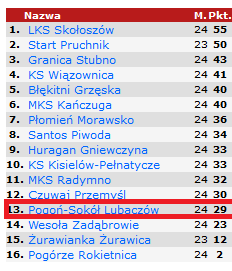 Po wygranej drużyny Pogonii z Rokietnicą lubaczowscy piłkarze mogli na chwilę zapomnieć o strefie spadkowej. Niestety, nasi zawodnicy długo nie cieszyli się z faktu, że mają duże szansę na pozostanie w "okręgówce". W niedzielę u siebie przegrali z KS Wiązownicą - drużyną, która plasuje się w górnej części tabeli. W Lubaczowie przez cały mecz obie drużyny grały równo, w pierwszej części goście mieli kilka dogodnych sytuacji, których jednak nie potrafili wykorzystać. Na boisku dobrze prezentowali się zawodnicy lubaczowskiej drużyny. Jednak to w drugiej połowie minimalnie lepsi okazali się piłkarze z Wiązownicy. Bogusław Sierżegą - trener gości skutecznie wykorzystał rzut wolny dzięki czemu KS Wiązownica objęła prowadzenie w meczu. Później goście zaciekle się bronili i nie pozwolili lubaczowianom przedostać się pod bramkę drużyny przeciwnej. W 82' minucie spotkania sędzia wskazał "jedenastkę". Faulowany w polu karnym był Piotr Misiąg, ale rzutu karnego nie wykorzystał Marek Syty.