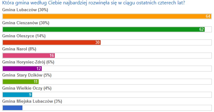 210 osób wzięło udział w naszej ankiecie, w której pytaliśmy się was o to, która gmina w ciągu ostatnich czterech lat najbardziej się rozwinęła. Według naszych czytelników jest to gmina Lubaczów. Najmniej, bo tylko 6 głosów otrzymała Gmina Miejska Lubaczów!