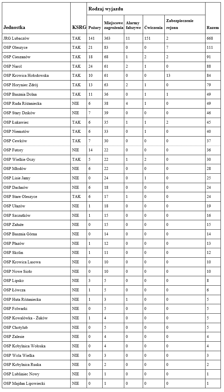 Liczba wyjazdów strażaków z poszczególnych jednostek powiatu lubaczowskiego