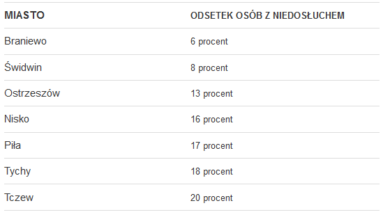 Najgorsze wyniki w poszczególnych miastach, czyli największy procent osób z niedosłuchem powyżej 50 procent przebadanych