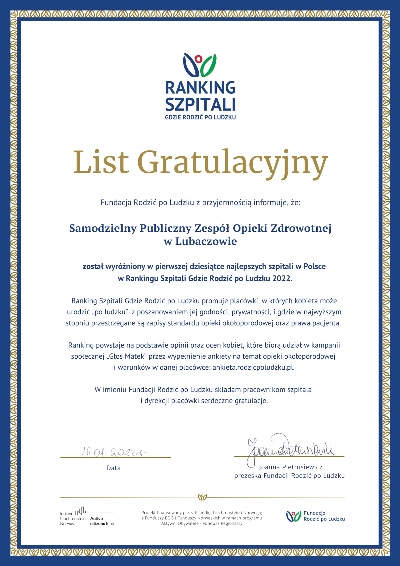Fundacja Rodzić Po Ludzku to organizacja działająca na rzecz kobiet w ciąży i matek małych dzieci, która od ponad 20 lat monitoruje placówki położnicze pod kątem respektowania przez nie prawa kobiet w opiece okołoporodowej. Od lutego 2018 r. fundacja w sposób ciągły zbiera dane w ramach akcji "Głos matek ma moc zmiany" poprzez ankiety wypełniane przez kobiety, które urodziły siłami natury bądź przez cięcie cesarskie. Pytania zawarte w kwestionariuszu dotyczą m.in. przygotowania do porodu, doświadczeń z izby przyjęć, sali porodowej i pobytu na oddziale położniczym, a także relacji z personelem medycznym, oceny warunków oraz opieki.