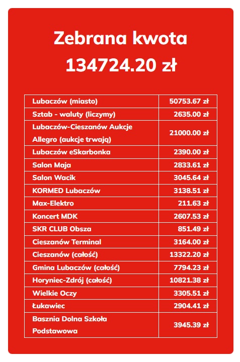 Ponad 134 tysięcy złotych zebrał lubaczowski sztab Wielkiej Orkiestry Świątecznej Pomocy. Na kwotę składają się m.in. zbiórki prowadzone przez Wolontariuszy, e-Skarbonki oraz suma z wszystkich licytacji na portalu Allegro, które wciąż trwają.