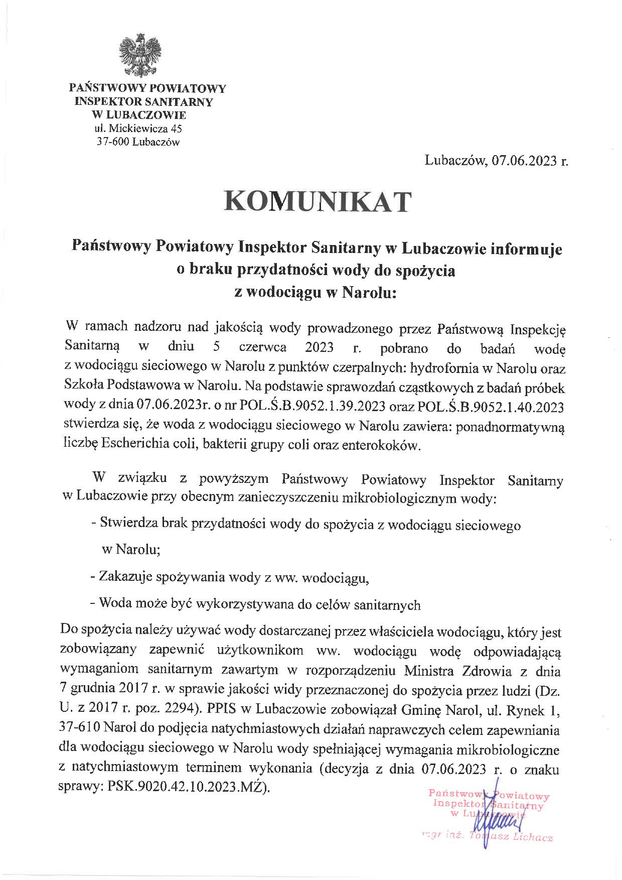 Sanepid zobowiązał gminę Narol do podjęcia natychmiastowych działań naprawczych celem zapewnienia dla wodociągu sieciowego w Narolu wody spełniającej wymagania mikrobiologiczne.
