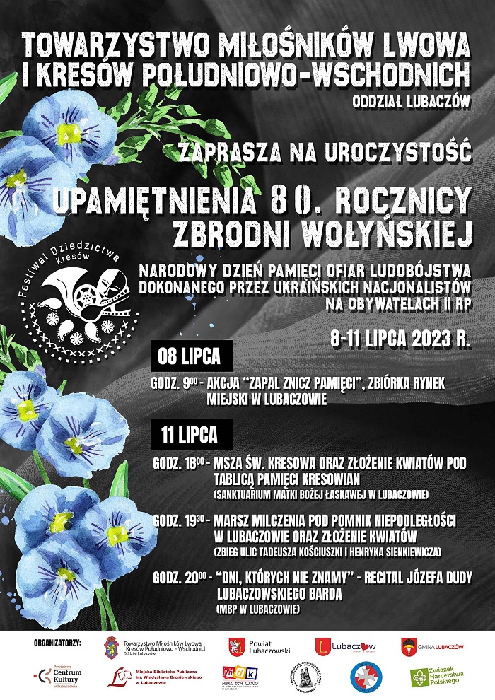 Towarzystwo Miłośników Lwowa i Kresów Południowo–Wschodnich oddział Lubaczów zaprasza na uroczystość upamiętnienia 80. rocznicy zbrodni wołyńskiej. Wydarzenie to organizowane jest w ramach Narodowego Dnia Pamięci Ofiar Ludobójstwa dokonanego przez ukraińskich nacjonalistów na obywatelach II Rzeczypospolitej Polskiej.