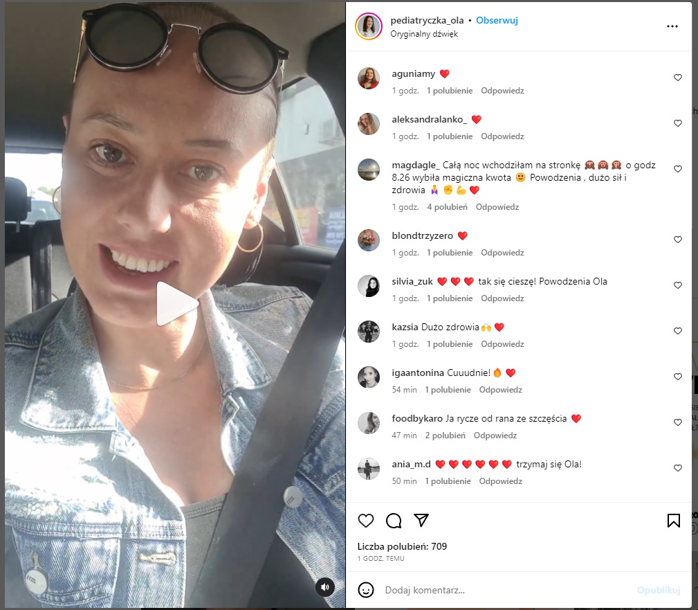 - Mamy to! [...] Nadaję z auta, jadę na chemię [...] Dziękuje jeszcze raz! To co przeżyłam przez ostatnie dwa dni to był totalny rollercoaster… Nie spałam w ogóle, a teraz jadę na chemie - to jest zarąbiście symboliczne teraz. – powiedziała Ola