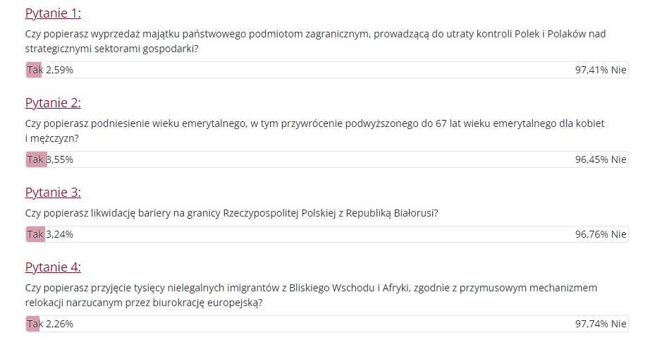 W kraju na pierwsze pytanie w referendum 96,49 proc. uczestników odpowiedziało "nie", a 3,51 proc. - "tak". Na pytanie o wiek emerytalny "nie" odpowiedziało 94,61 proc., a "tak" - 5,39 proc. Na pytanie o likwidację bariery na granicy z Białorusią odpowiedź "nie" wybrało 96,04 proc. głosujących, zaś "tak" - 3,96 proc. Z kolei na pytanie o nielegalnych imigrantów "nie" odpowiedziało 96,79 proc., a "tak" - 3,21 proc.
