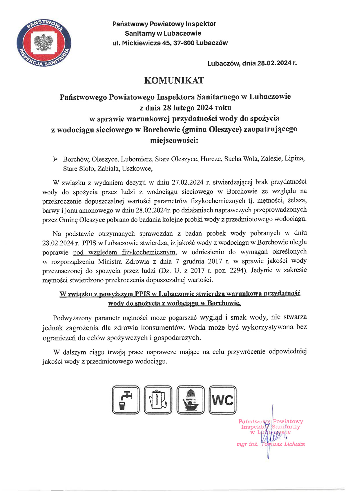 W związku z powyższym PPIS w Lubaczowie stwierdza warunkową przydatność wody do spożycia z wodociągu w Borchowie.