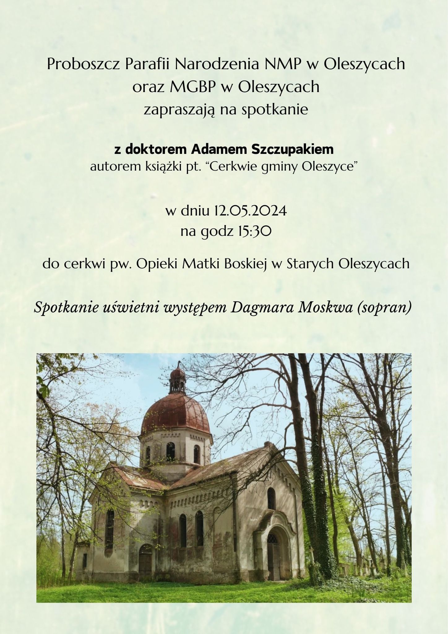 Na to niepowtarzalne wydarzenie zapraszają: proboszcz Parafii Narodzenia Najświętszej Marii Panny w Oleszycach i Miejsko- Gminna Biblioteka Publiczna w Oleszycach.