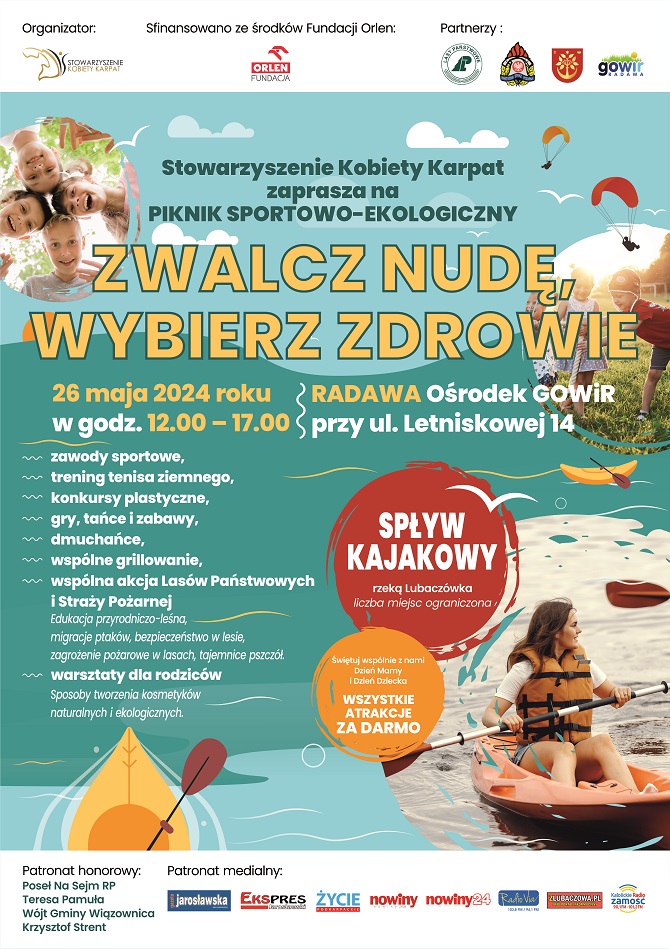 Stowarzyszenie Kobiety Karpat pod hasłem "Zwalcz nudę, wybierz zdrowie" zaprasza na piknik sportowo-ekologiczny, który odbędzie się już 26 maja o godzinie 12:00 w Ośrodku GOWiR w Radawie.