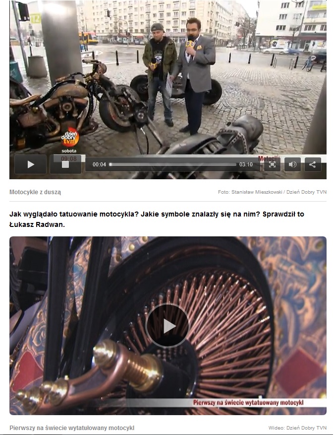 Od samego początku Stanisława Myszkowskiego ciągnęło do przerabiania i ulepszania maszyn. W 2012 r. założył własną firmę Game Over Cycles. Motocykle zbudowane przez GOC zdobywają wiele nagród na całym świecie. We współpracy z zespołem Behemoth, a w szczególności liderem formacji Adamem Nergalem Darskim firma zaprojektowała kolejne dzieło: Behemoth Bike. Ostatni projekt ekipy to The Recidivist, który jest pierwszym na świecie wytatuowanym motocyklem. Ile lat miał Stanisław Myszkowski, kiedy pierwszy raz przerobił motor? Ile waży Behemoth Bike? Jak długo przerabia się motocykle? Gościem Dzień Dobry był Stanisław Myszkowski. - czytamy na stronie programu