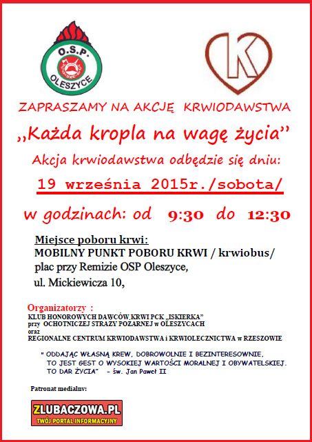 Klub Honorowych Dawców Krwi "ISKIERKA" przy Ochotniczej Straży Pożarnej w Oleszycach oraz Regionalne Centrum Krwiodawstwa i Krwiolecznictwa w Rzeszowie serdecznie zapraszają na kolejną zbiórkę krwi która odbędzie się w dniu 19 września.