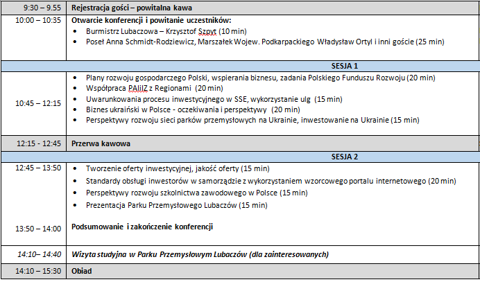 Mamy nadzieję, że nasza konferencja będzie dla uczestników źródłem aktualnej wiedzy o planach rozwoju gospodarczego Polski, o uwarunkowaniach i możliwościach inwestowania, o perspektywach dla biznesu ukraińskiego w Polsce i polskiego na Ukrainie. Chcemy też, aby przedstawiciele biznesu oraz samorządów mogli zapoznać się z procesem tworzenia ofert inwestycyjnych i standardów obsługi inwestorów, zgodnie z wytycznymi instytucji odpowiedzialnych za upowszechnianie ofert i budowanie płaszczyzny kontaktów pomiędzy przedsiębiorcami i samorządami. Naszą intencją jest też, aby przedsiębiorcy pozyskali wiedzę, jak zdobywać kompletne informacje, niezbędne do planowania i przygotowania inwestycji, o dostępnych ulgach i ułatwieniach, o perspektywach rozwoju szkolnictwa zawodowego. Podczas obrad opowiemy też o procesie tworzenia Parku Przemysłowego Lubaczów, osobom zainteresowanym zapewniamy wizytę studyjną w Parku. Staraliśmy się tak dobrać tematykę i osoby prelegentów, aby konferencja była wydarzeniem ciekawym i pożytecznym. Ufamy też, że nasze wydarzenie będzie okazją do indywidualnych spotkań i rozmów z ekspertami, przedstawicielami biznesu i instytucji pracujących na rzecz przedsiębiorców. – mówią organizatorzy konferencji