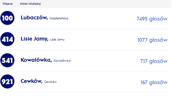 Obecnie największą szanse na nowy plac zabaw ma Lubaczów, który w tym momencie zajmuje 100 miejsce. Ponad 6 tysięcy głosów mniej mają Lisie Jamy, które znajdują się w dole ogólnopolskiej tabeli. Jeszcze niżej są Kowalówka i Cewków.