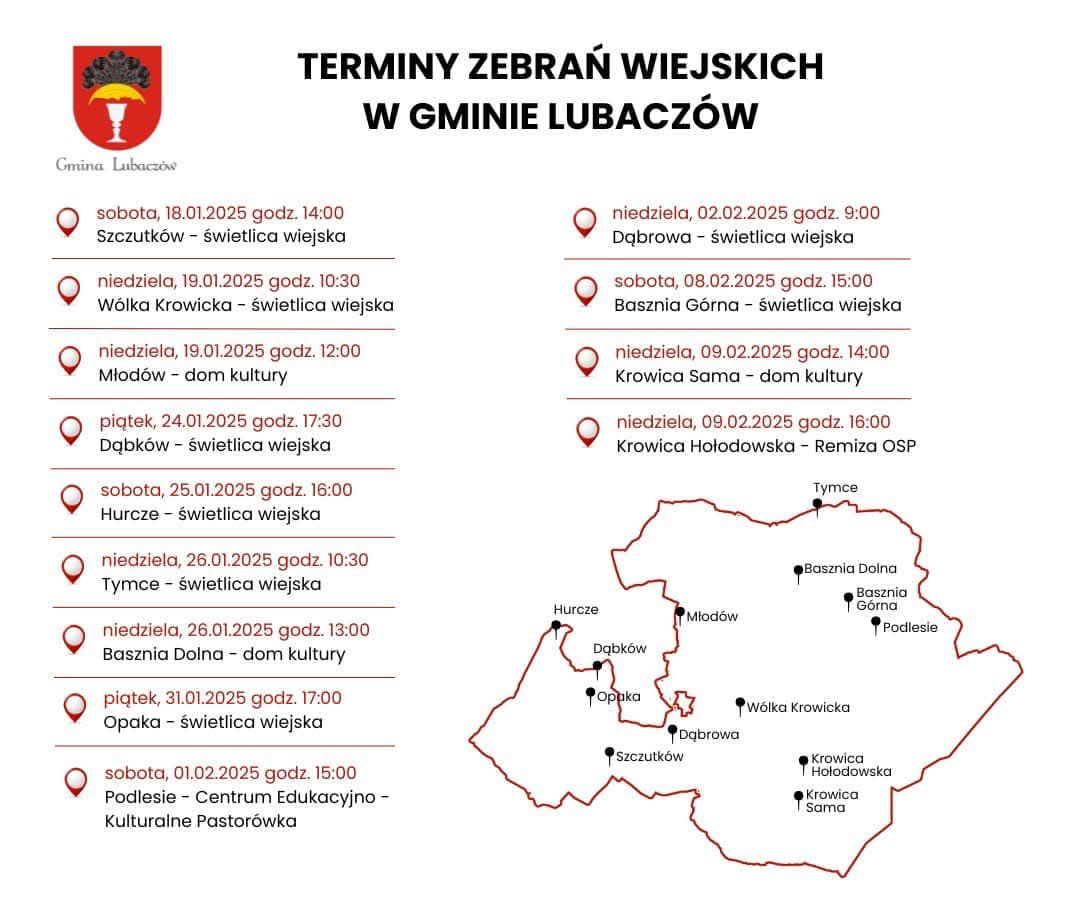 W styczniu i lutym 2025 roku mieszkańcy sołectw w Gminie Lubaczów będą mieli okazję uczestniczyć w zebraniach wiejskich, które odbędą się w świetlicach, domach kultury oraz innych miejscach publicznych na terenie gminy. Sprawdźcie harmonogram.