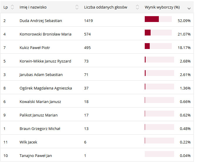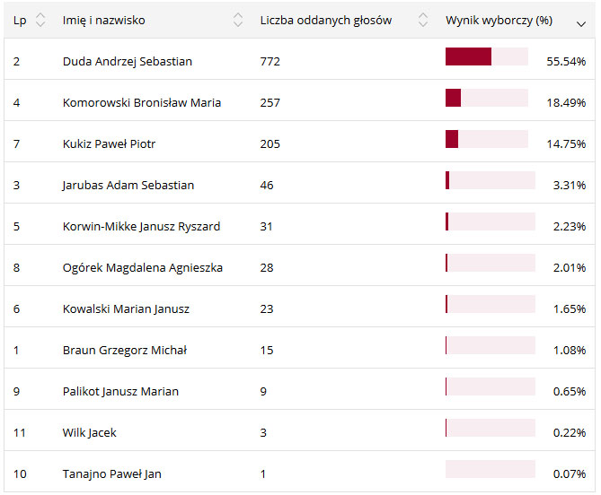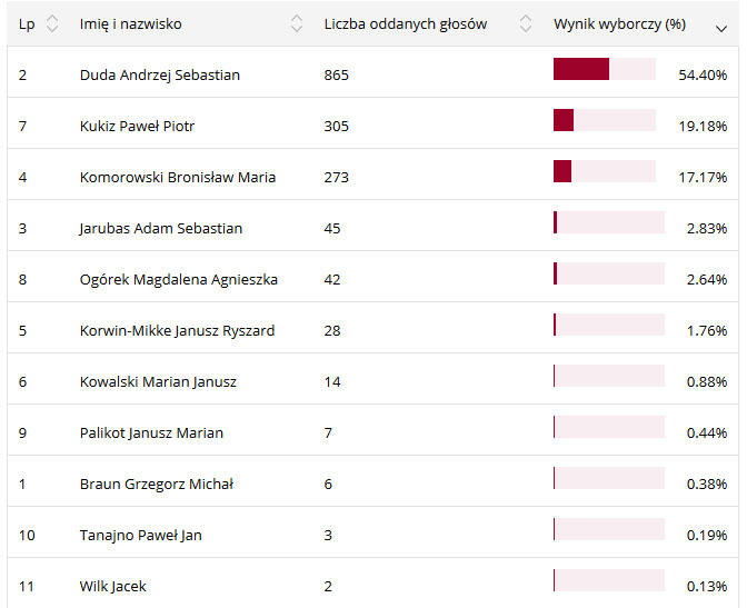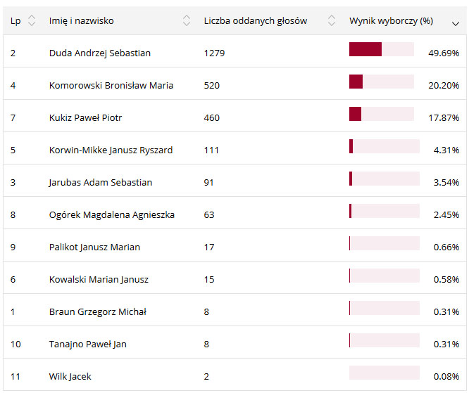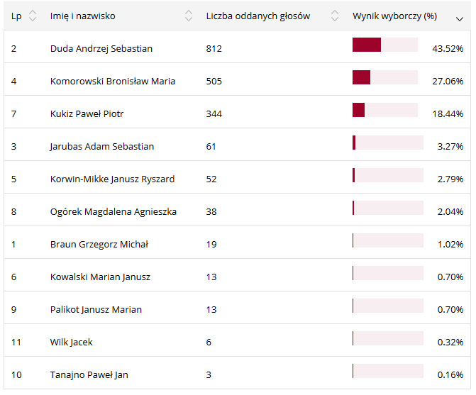 Pozostali kandydaci uzyskali słabe poparcie wśród mieszkańców powiatu. Poniżej tabela z wynikiem poszczególnych kandydatów w powiecie lubaczowskim: