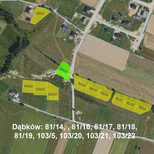 - Dąbków – działki nr 81/14, 81/16, 81/17, 81/18, 81/19, 103/5, 103/20, 103/21, 103/22 (przetarg: 19.02.2025 r.)