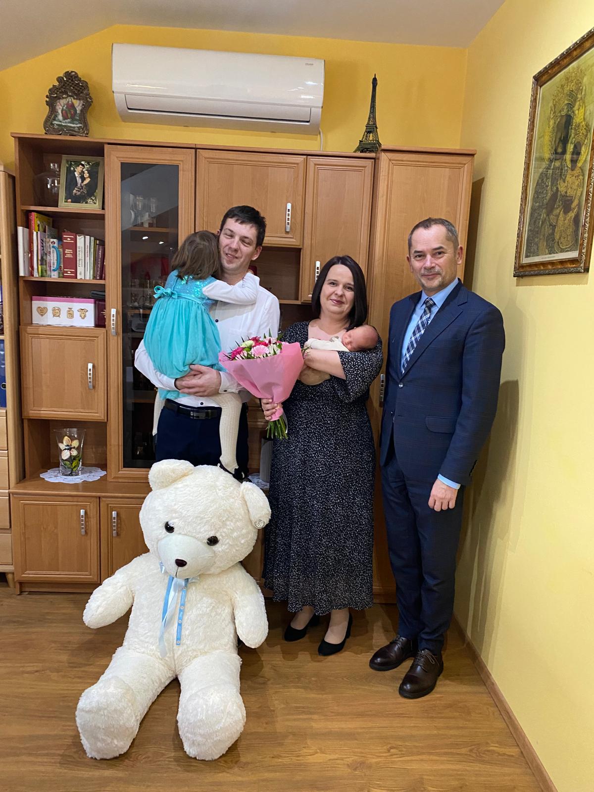 Z tej okazji rodzinę odwiedził wójt gminy Lubaczów Wiesław Kapel wraz z Lucjaną Soroń, pracownikiem ds. ewidencji ludności. Podczas spotkania przekazano upominki oraz gratulacje z okazji narodzin dziecka i powiększenia rodziny.